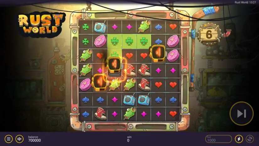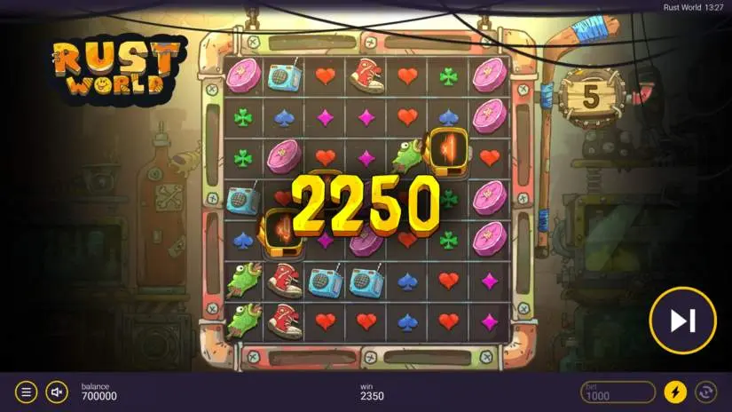 Paylines in Rust World can be vertical or horizontal. To calculate your total win, tally up all line wins and add them together. To calculate a single line win, count the number of matching symbols in a row on a line, either vertically or horizontally. If five or more matching symbols line up, find the win value in the dynamic paytable. Only the highest winning combination per line is paid. After the free spins round ends, all wins are added to any win from the game that triggered the free spins. Simultaneous or matching wins are added together and paid out.