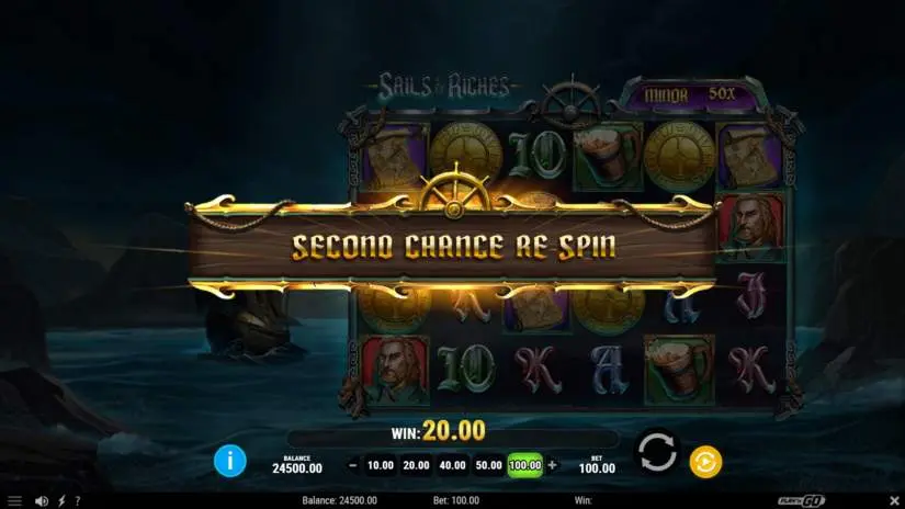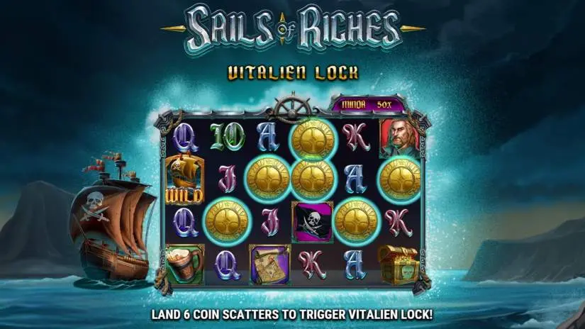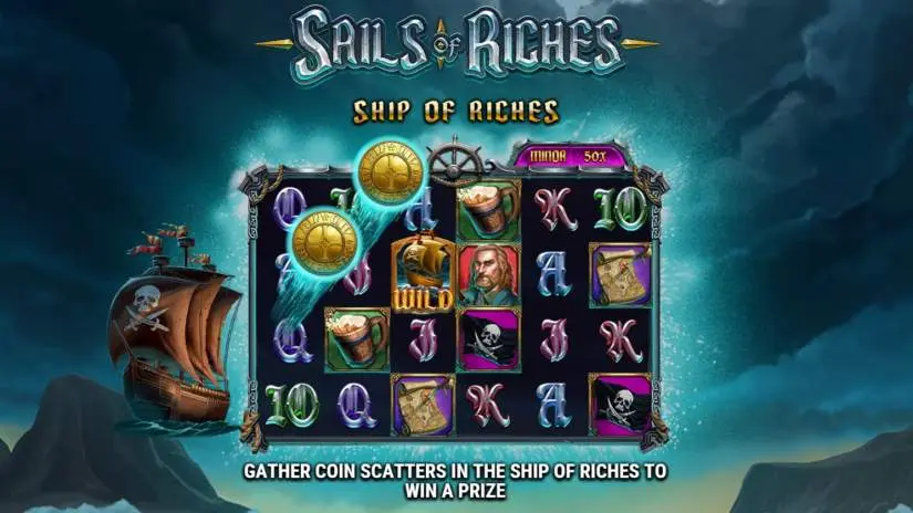 If 5 or fewer COIN SCATTERS appear on the reels, they will form a SHIP OF RICHES feature. The size of the SHIP OF RICHES is purely visual and will not affect the likelihood of triggering the feature. If 1 or more COIN SCATTERS appear, the SHIP OF RICHES feature has a chance to trigger. Bonus prizes: MINI: 20x, MINOR: 50x, MAJOR: 100x, and GRAND: 1000x the total bet.