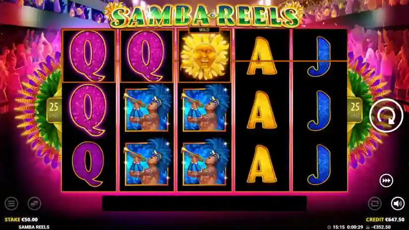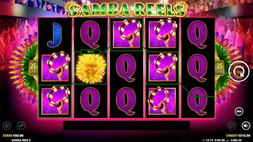The Wild symbol (sun) in Samba Reels from Blueprint Gaming can be used to form winning lines by substituting for other symbols. The Wild symbol (sun) cannot substitute for Scatter symbols (the Party symbol).