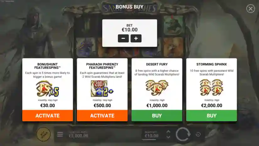 This bonus retains the base game mechanics with an increased chance of Scarab Wild Multipliers appearing. If additional FS symbols land simultaneously during the bonus, additional free spins are awarded: