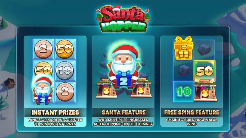 Step into a Christmas fairytale in the Santa Hopper online slot from Push Gaming for an unforgettable experience! Check out the Santa feature, where the jolly saint appears on the game board with a pile of presents! The Bubble feature opens up new ways to win with expanding stacks that can boost the chimney symbol, the Santa symbol, or any instant prize it touches. With the return of the iconic Cluster Link™ mechanic, Santa Hopper reimagines the classic Push feature in this exciting holiday adventure! Santa Hopper is a 7-row, 7-column matching symbol game.