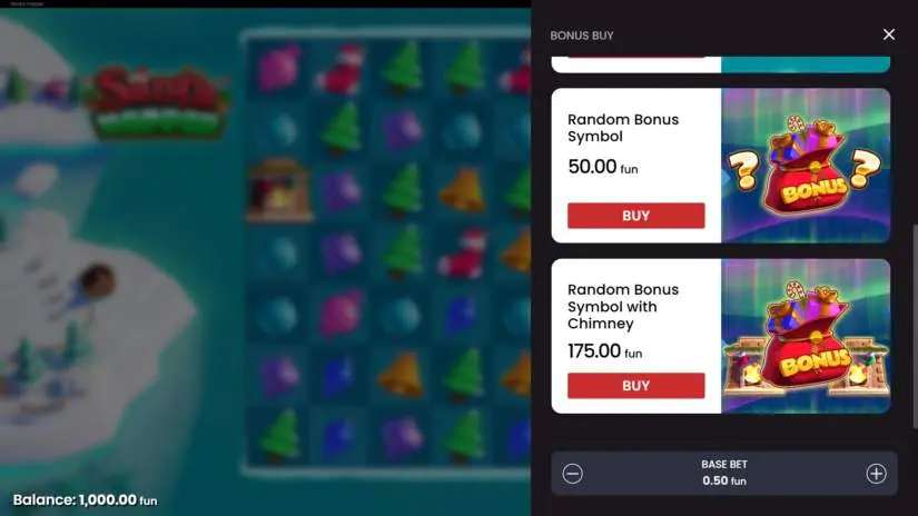 The Santa symbol is available in the main game and in the free spins bonus game. The Santa symbol has an initial multiplier, which can be x1, x2, x3, x4, x5, or x10. The multiplier increases by one each time it appears during the Santa bonus game. When the Santa symbol contributes to a cluster win, it locks in place and remains on the screen until the end of the Santa bonus game.