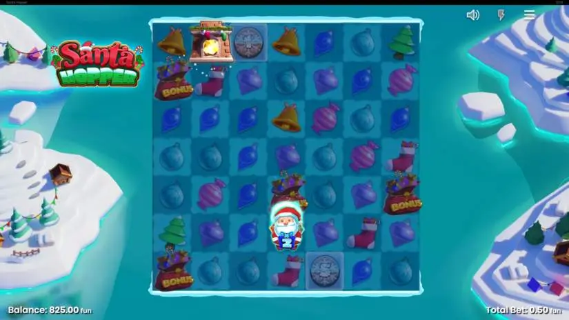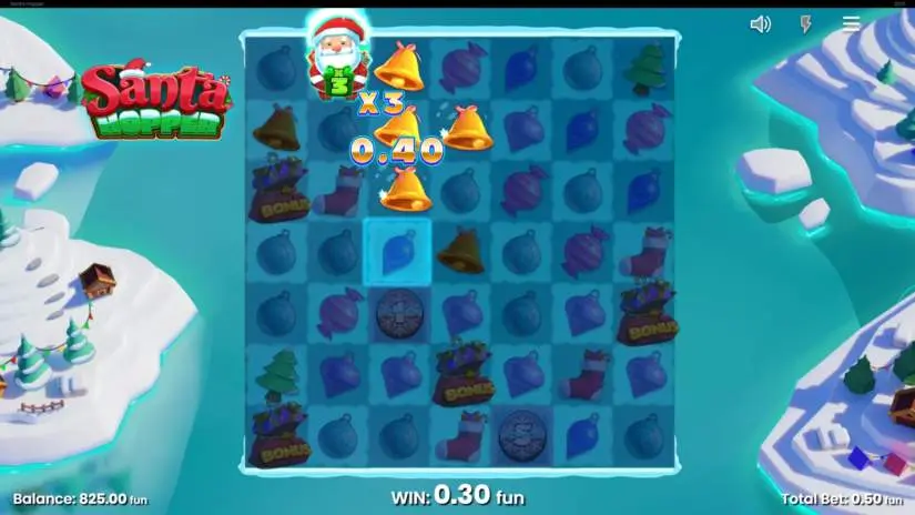 At the start of Santa Hopper, all symbols from the previous game are removed from the game board, and new symbols cascade from the top of the screen. When a cluster win occurs, the symbols involved in the cluster win are removed, and all remaining symbols on the game board collapse downward. Additionally, new symbols fall from the top of the screen, filling all available positions on the game board.