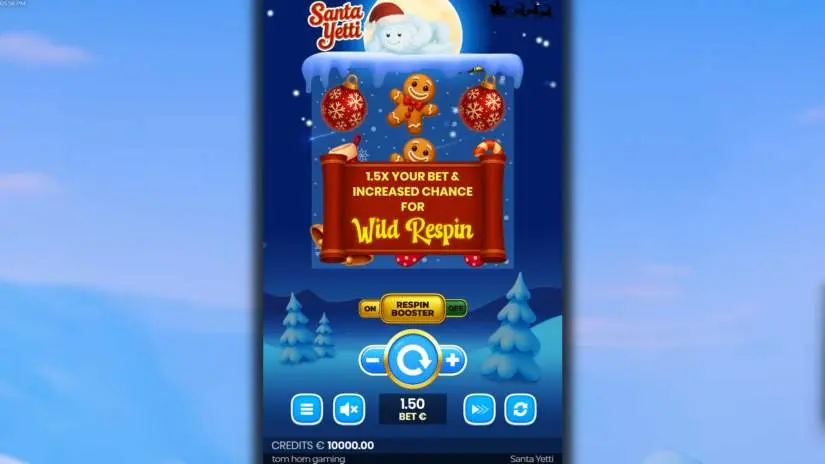 The “Respins Booster” button can be activated to multiply the total bet by 1.5x. This feature remains active until the user deactivates it by returning to the standard bet by pressing the toggle button. When activated, it increases the chance of a re-spin by 300%.