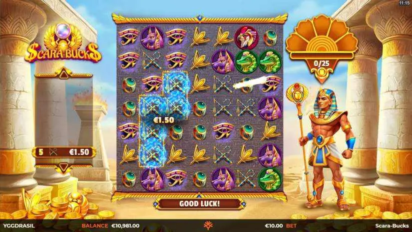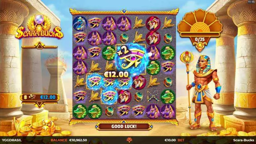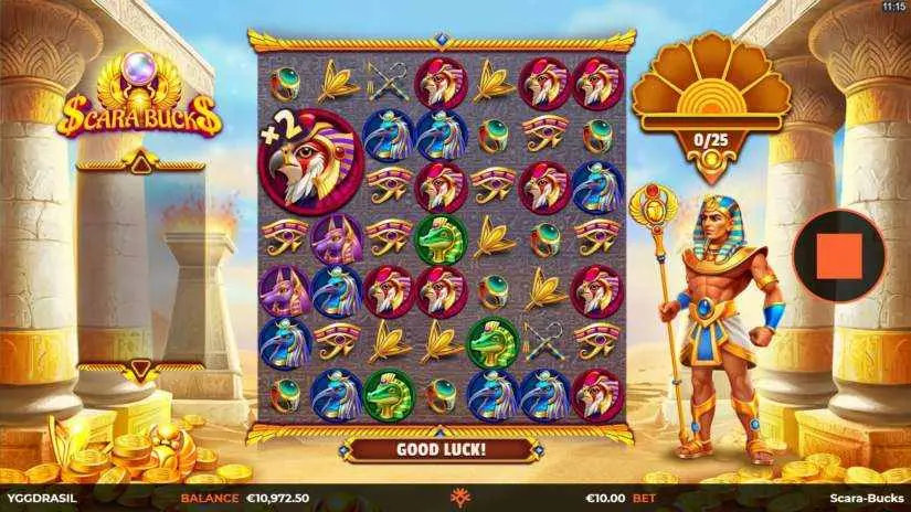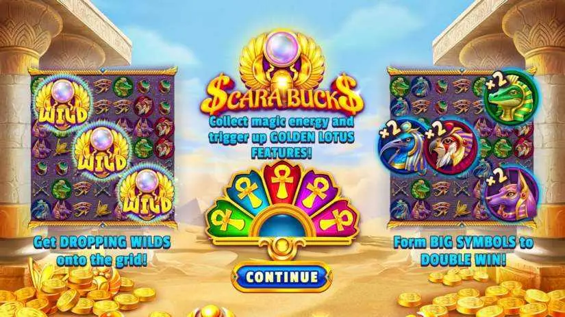 Welcome to the Scara-Bucks video slot from Yggdrasil Gaming, featuring the Scarab Wild, Scarab’s Move, Pharaoh’s Charge, Golden Lotus, Wild’s Blessing, Wild’s Wrath, Wild’s Charm, Wild’s Splash, and Divine Blessing features!