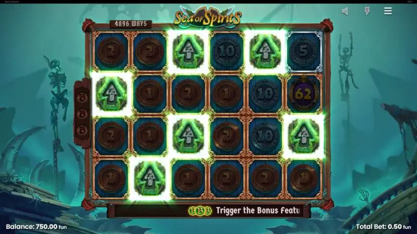 In the “Sea of Spirits” slot, winnings from 4,096 paylines in the main game increase to 2,985,984 paylines in the bonus and super bonus features. A symbol win is awarded when the same symbol appears on multiple adjacent reels, starting with the leftmost one. Payouts are awarded only for the longest winning combination.
