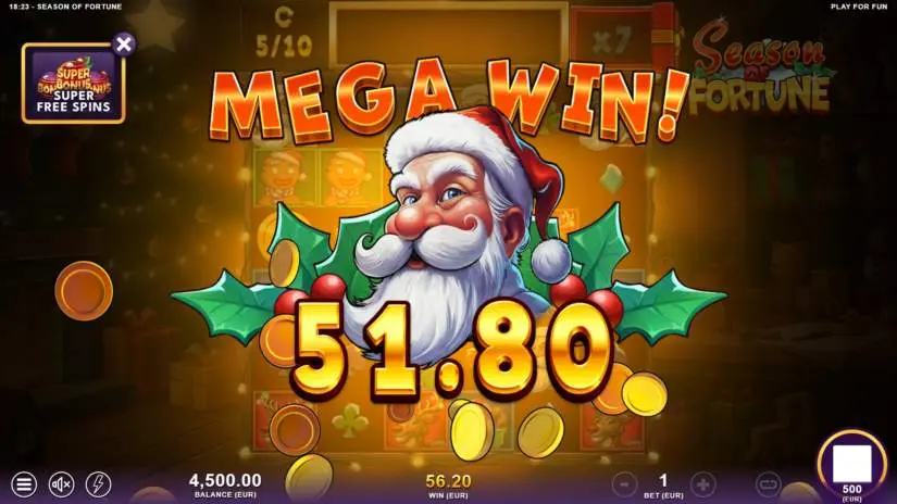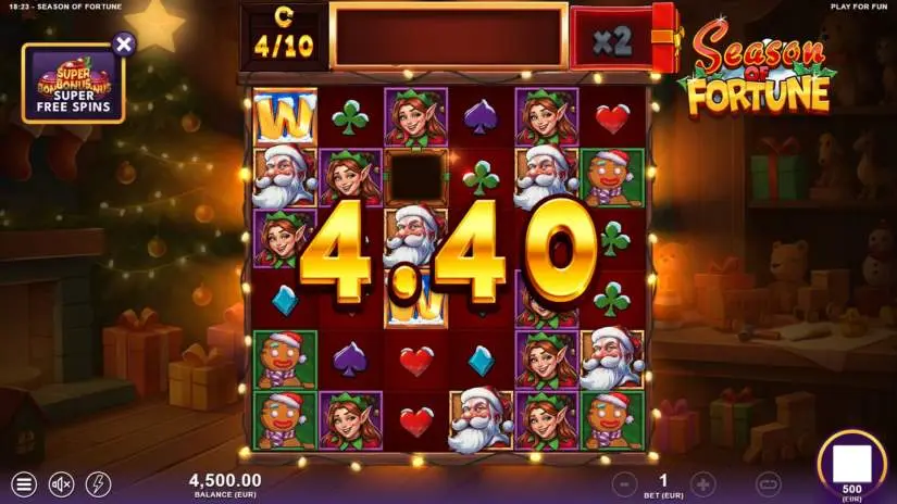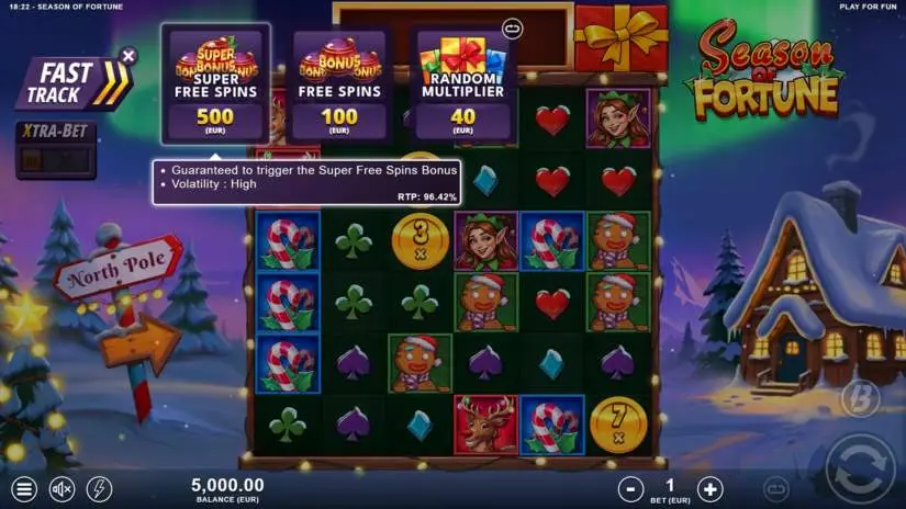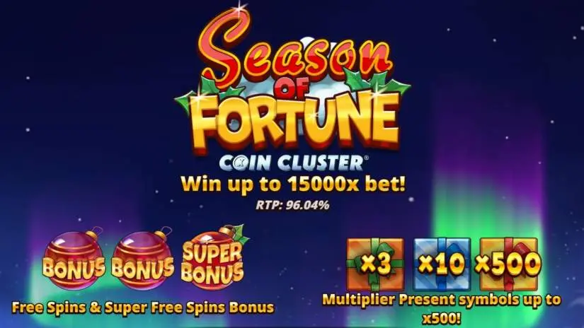 The theoretical return to player (RTP) for the Season of Fortune slot is 96.04%, and the maximum win is 15,000 times the bet. If the total win during a game round reaches 15,000x the bet, the round ends and the winnings are paid out.