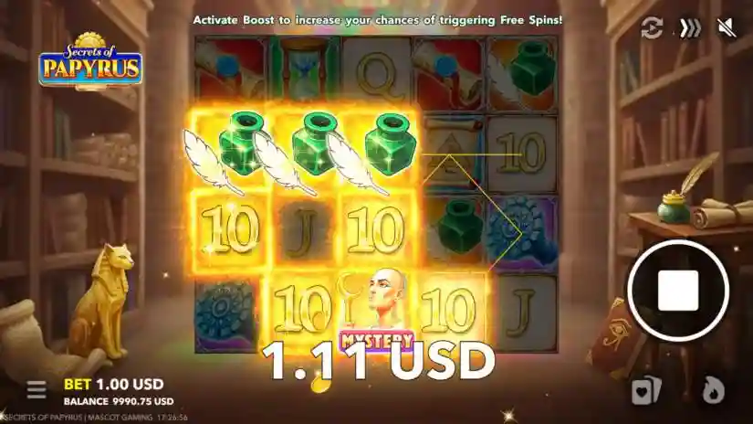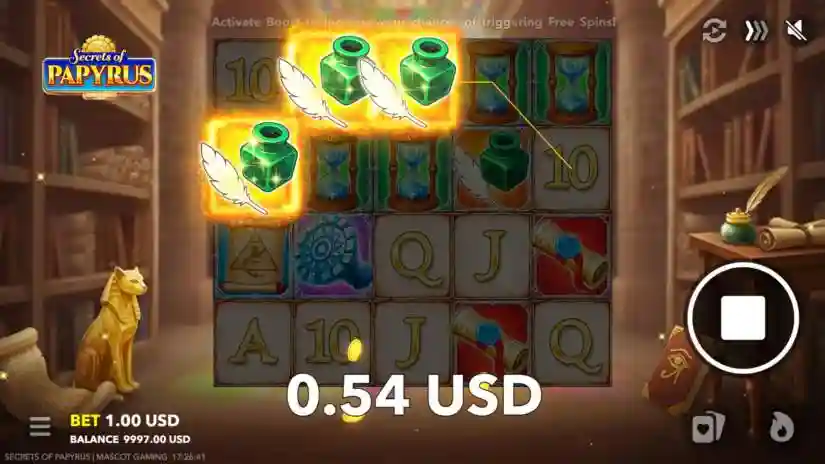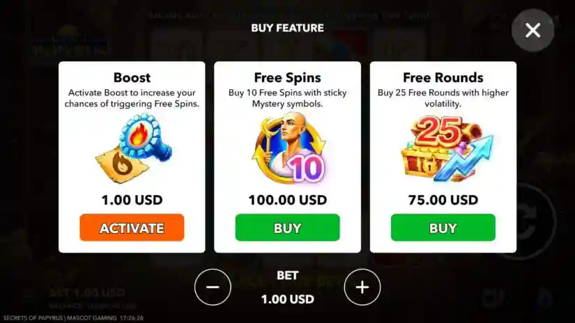 Secrets of Papyrus is a 5-reel, 4-row video slot from Mascot Gaming, featuring 20 fixed paylines that pay out from left to right. The game begins with the base game, where the total bet is set on each spin based on the selected amount. During the game, players can activate the Free Spins feature or enter the Risk feature after any winning spin.