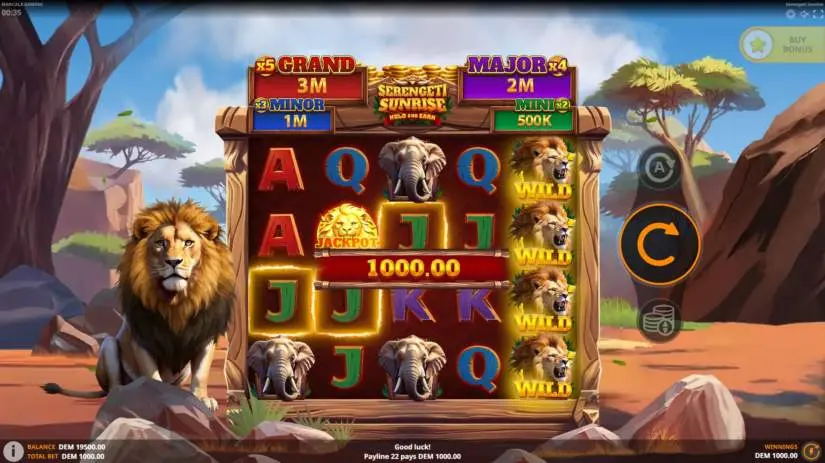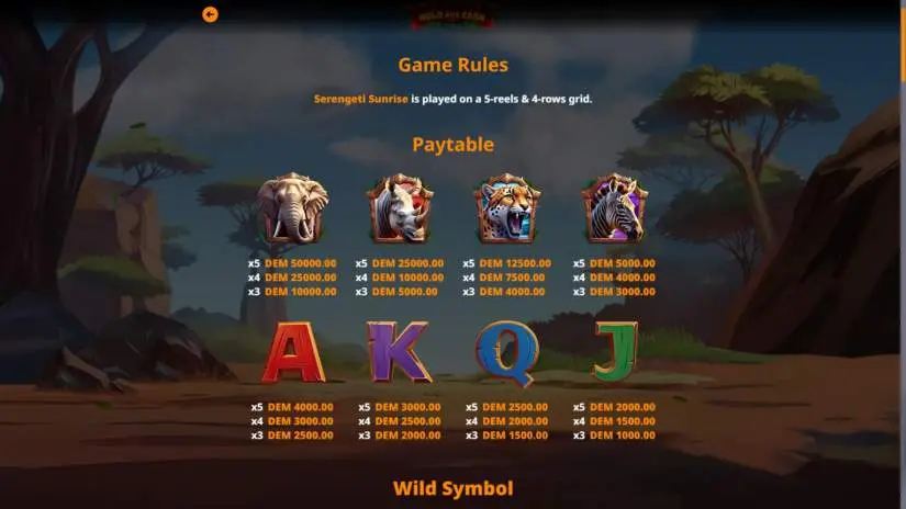 The maximum win in Serengeti Sunrise is capped at 5,000x your bet. If your winnings, including those received through the Risk Game, exceed this limit, the final payout will be capped at 5,000x your bet.