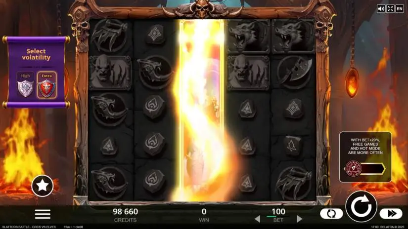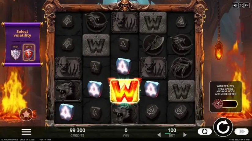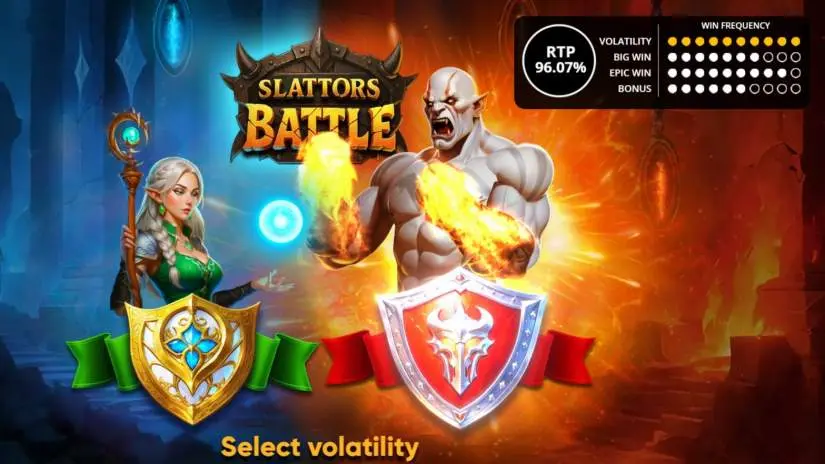CHOOSE YOUR PLAYER in Slattors Battle from Belatra Games! The game’s volatility depends on your Hero. Elves win slightly more often, but big wins are slightly less common. Orcs win slightly less often, but big wins are more common. Each Hero has its own set of resources.