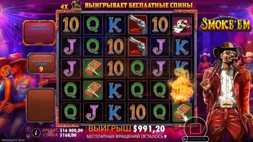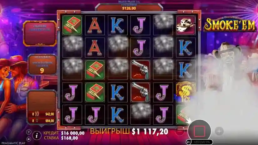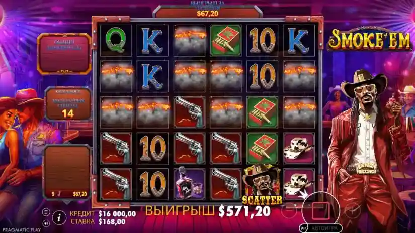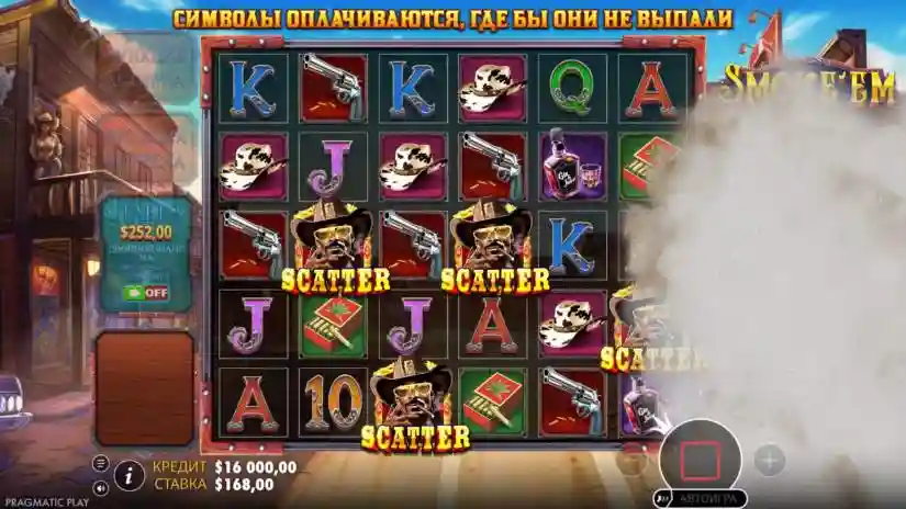 Symbols in the Smoke’Em slot from Pragmatic Play pay out anywhere on the screen. The total number of matching symbols on the screen at the end of a spin determines the winning amount.