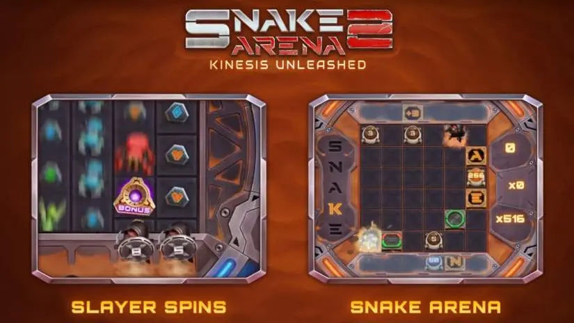Snake Arena 2 – Kinesis Unleashed is a 6-reel, 4-row, 14-payline slot from Relax Gaming. A payline is formed by matching symbols on adjacent reels, located on one or more paylines, starting with the leftmost one. Winning combinations and payouts are determined according to the paytable. Only the highest combination on each line is paid. Once a spin begins, the bet for that round is locked and cannot be changed. The Wilo symbol substitutes for all symbols on the reels. Wins on multiple paylines are cumulative. Scatter symbols are present on all reels and act as wild symbols when included in a win. A minimum of 1 and a maximum of 5 Slayer symbols appear below the reels on each spin, each with a multiplier value of 2x to 1.0x. When a Wild symbol lands on the reels above the Slayer, its multiplier value is projected onto the Wild symbol, and this value will be applied to all wins that land through it.