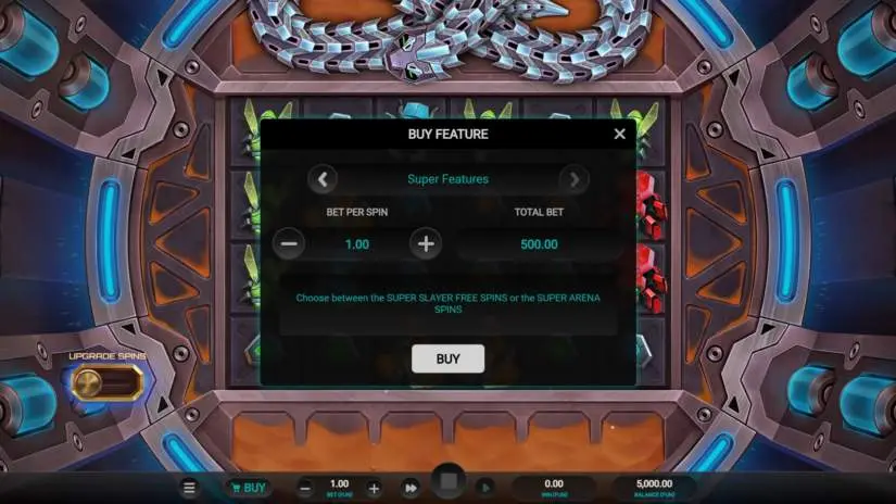 If a win exceeds the minimum required threshold, at the end of the Super Slayer and Super Arena free spins, the player will be offered the opportunity to purchase an extra spin. If an extra spin is offered, the player is not obligated to accept it, and all winnings may be credited and added to the player’s main balance. The player’s main balance cannot be considered as full or partial payment for an extra spin. The offer will not be made if the current winnings from a free spin or bonus round do not cover the cost of the extra spin. Additional spin offers will be made until the player collects their winnings or the winning balance falls below the cost of the extra spin. An extra spin will not be offered if the calculated cost is less than 100x. The extra spin will be played at the current bet amount. The maximum amount that can be spent on an extra spin is limited to 10,000x. The theoretical return to player (RTP) for an extra spin is 96.50%.