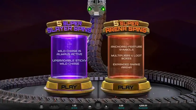 Participating in the Slayer Free Spins awards 5 free spins. During the Slayer Free Spins, the snake is always awake and hunting for Slayers. On each spin, Slayers 1 and s randomly appear at the base of the reels. Each Slayer has a multiplier ranging from 2x to 1000x. The Slayer’s position and multiplier values change with each Slayer appearance. If the snake selects a reel with a Slayer at the base, it launches an attack. The Slayer at the base of the reel defends it and jumps to stop the snake’s fall. When a link is created between a Slayer and a Slayer, the Slayer becomes a Wild symbol, and its multiplier is added to it. When a link is created between a Slayer and a Slayer, the snake will continue its hunt if additional Slayers appear. The Wild Chase feature continues until all Slayers have been attacked and defended, or until the snake selects a reel without a Slayer to attack. If more than one reel is protected from attack and is Wild, their multipliers are added together when calculating wins. Landing three Scatter symbols during Slayer Free Spins will award an additional 5 spins. Landing four Scatter symbols during Slayer Free Spins will increase the number of remaining spins and also add 5 additional spins to the Super Slayer Free Spins. Slayer Free Spins will end once all spins have been completed.