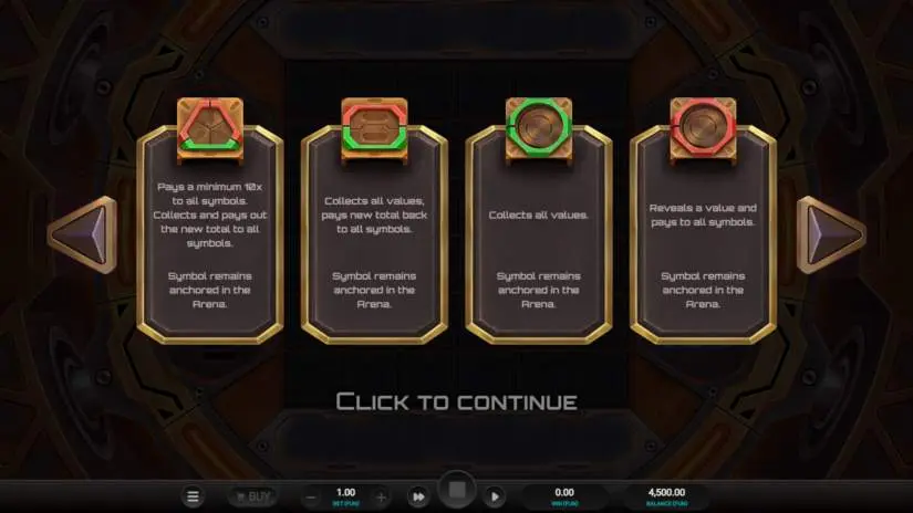 Collects and combines all visible values in play in the arena, then pays the new total value to all collected symbols.