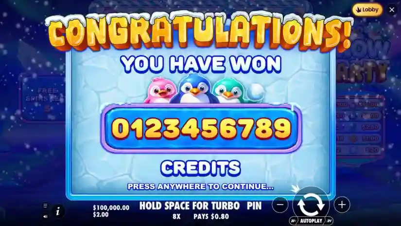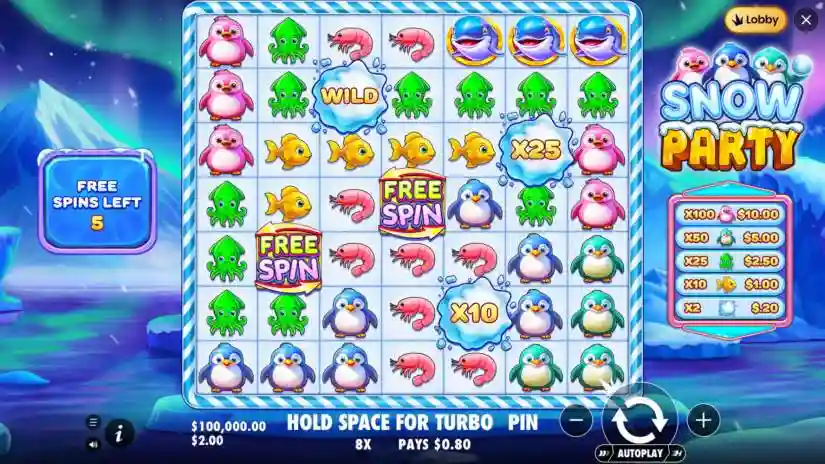 The maximum win in Snow Party is capped at 5,000x the bet in both the main game and free spins. If the total win during the FREE SPINS ROUND reaches 5,000x the bet, the round ends immediately, the winnings are credited, and all remaining free spins are forfeited.