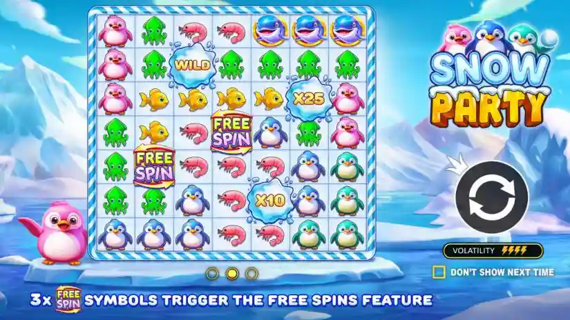 Dress warmly for an icy celebration in Snow Party from Pragmatic Play. All symbols pay out when blocks of at least 5 symbols are formed, connected horizontally or vertically. The game is played on a 7×7 symbol grid.