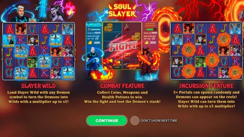 If the Invasion feature is active and the Slayer Wild symbol appears on the same spin, the Slayer feature is activated. Midway through the spin, 5 or more portals appear, each revealing the same high-paying Demon symbol. After the portals reveal their symbols, the reels complete the spin. If the Slayer Wild symbol appears on the same spin, it activates and attacks only the Demon symbols revealed through the portals. These are then destroyed and transformed into Wild symbols or Wild multiplier symbols (x2–x5).