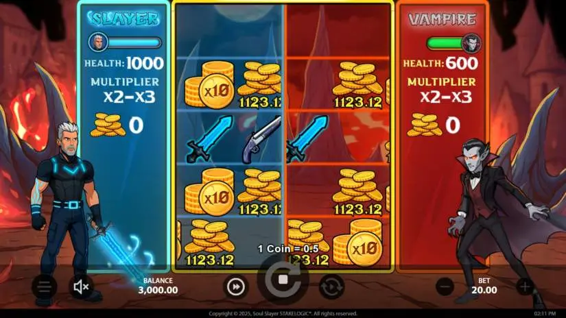 Victory – If the Slayer wins the battle, all coins collected by the Demon during the round are taken and added to the player’s total winnings, and the player advances to the next round. Defeat – If the Slayer loses, the battle immediately ends, and the total winnings are calculated based on the coins collected by the player over all completed rounds, as well as all the Demon’s coins collected from previous victories.