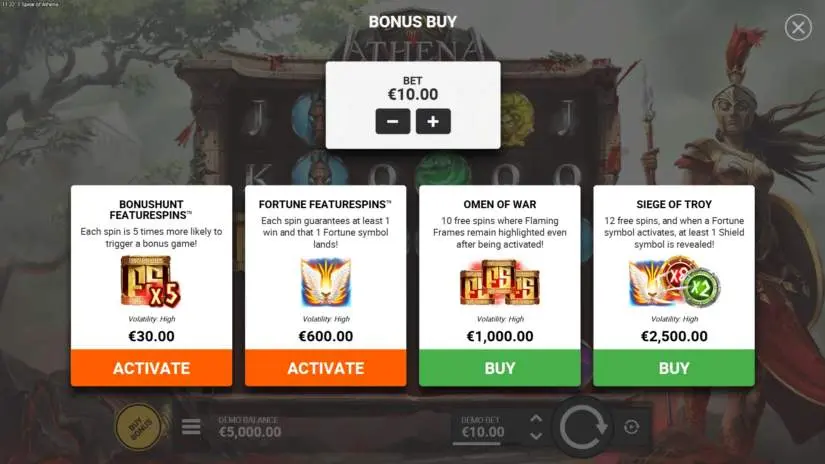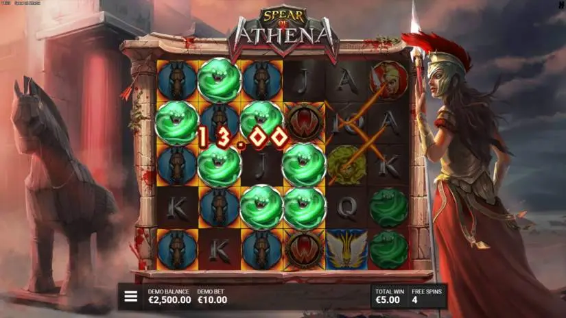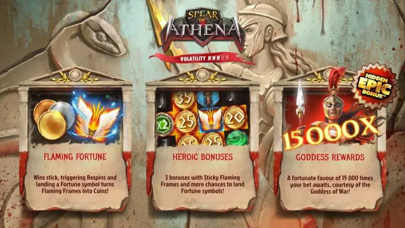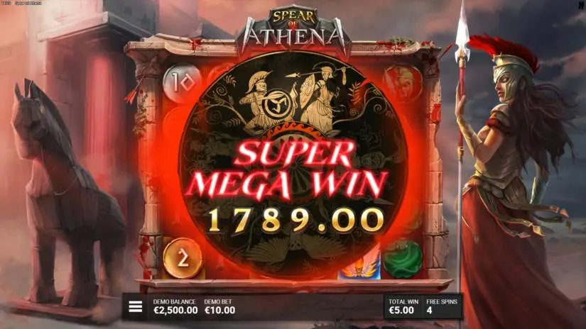The maximum win in Spear of Athena is 15,000 times the current bet level. The maximum win can be achieved by activating certain combinations and/or features.