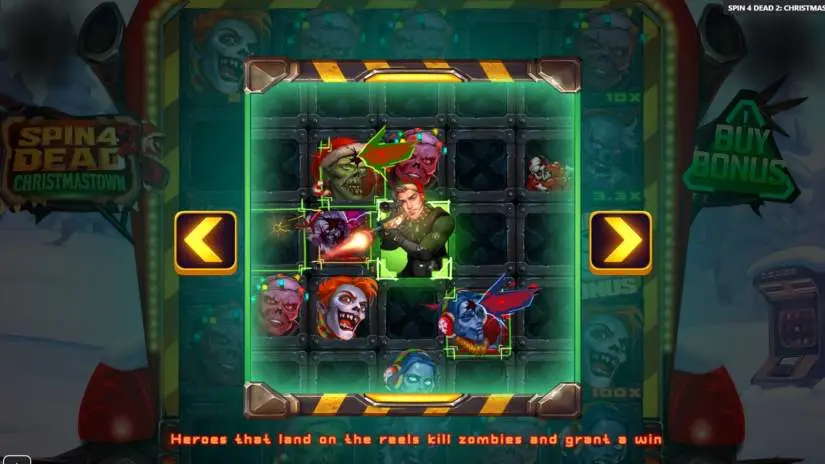 To calculate a single win in Spin 4 Dead 2: Christmastown, count the number of identical symbols on a payline, along a reel, or in a cluster combination. To calculate your total win, add up all individual wins. Combination payouts are listed in the paytable. Scatter symbols do not need to be on a payline or in a cluster to receive a prize.
