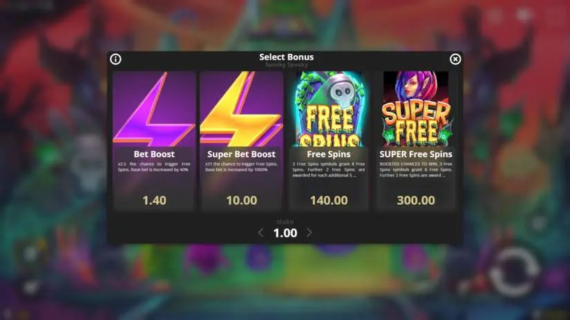 Activating the Bet Up feature increases your bet by 1000%, increasing your chances of winning free spins by approximately 31 times. You can increase your bet by clicking the “Buy Feature” button. While the Super Bet Boost feature is activated, winnings are calculated based on the base bet, not the increased “boost” bet. Super Bet Boost can only be activated or deactivated before placing a bet on a spin. If autoplay is running, autoplay must be stopped before activating or deactivating Super Bet Boost. RTP when playing with Super Bet Boost activated: 94.16%.