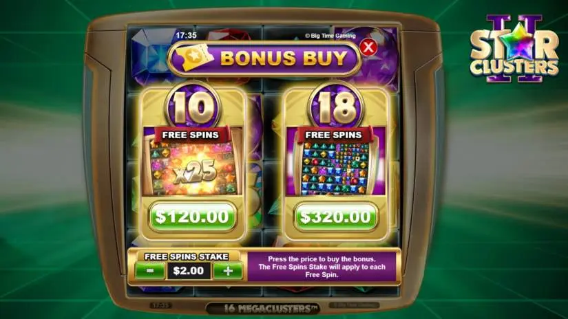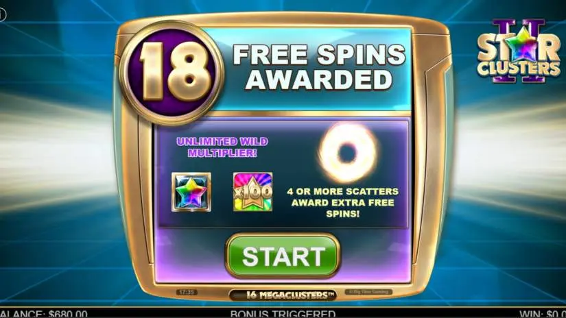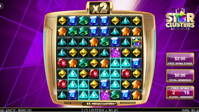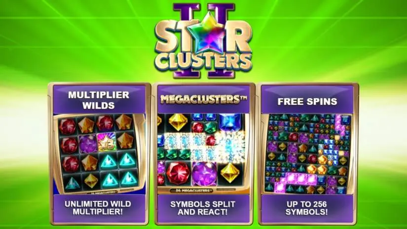 Star Clusters II by Big Time Gaming is a MEGACLUSTERS™ game that starts with 4 rows and 4 columns in the base game and 8 rows and 8 columns in Free Spins. Winning symbols split and react, allowing up to 256 symbols to appear during Free Spins.