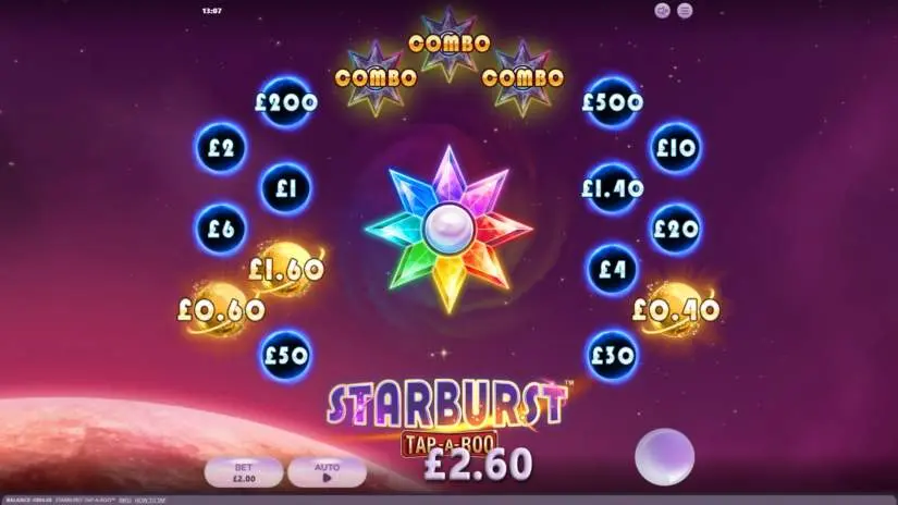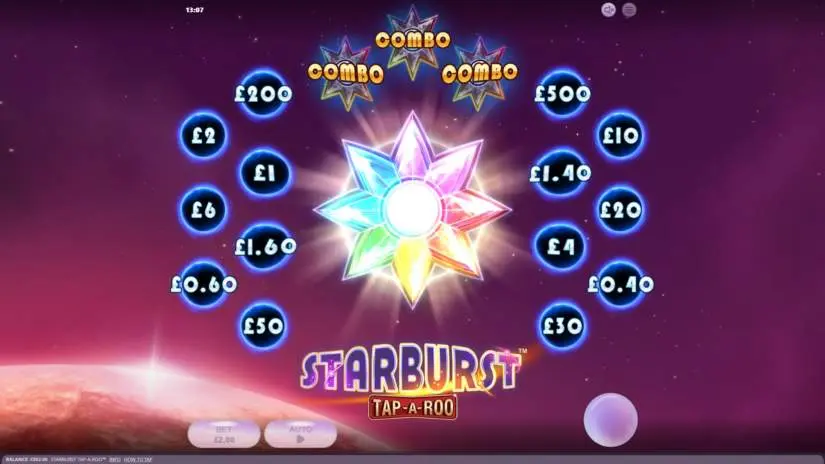Every time you place a bet in NetEnt’s Starburst Tap-A-Roo, some rays of the main Star in the center of the reel light up. Lighting all rays of the main Star triggers a Starburst, which activates three random sectors. Activating a CASH sector awards a corresponding CASH PRIZE. Activating a COMBO sector triggers another Starburst. The number of rays lit with each bet is random and is for visual amusement only. This does not affect the Star activation, which occurs randomly.