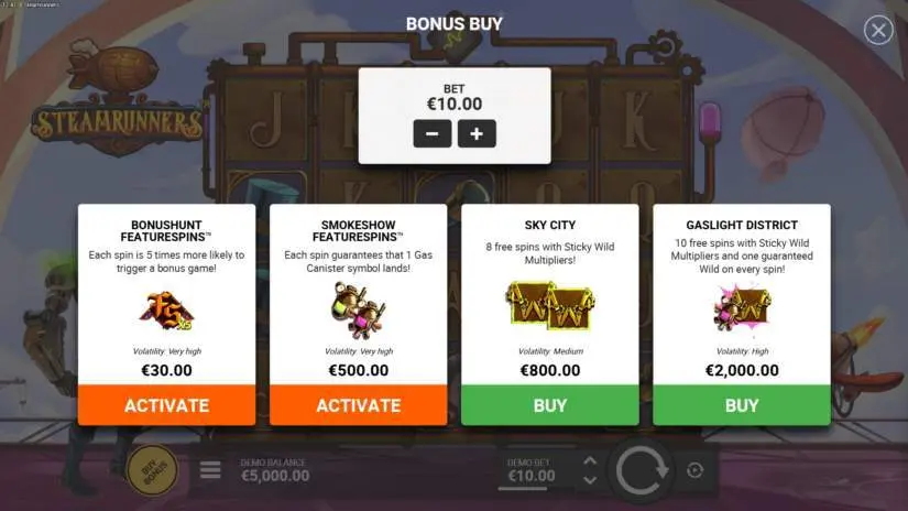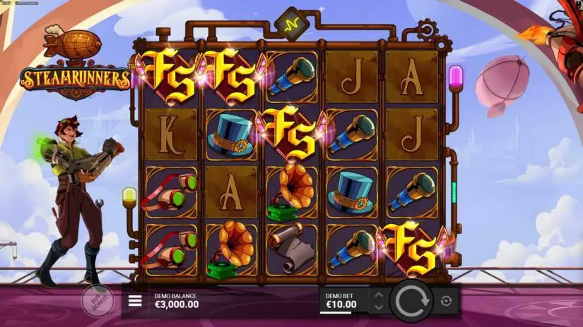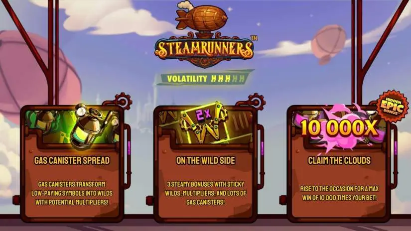 Steamrunners is a 5-reel, 4-row, payline game from Hacksaw Gaming where sky-high wins are just around the corner. Light the gas canisters, unleash the power of Wilds, and rise to the top win of 10,000x your bet, available in all game modes!