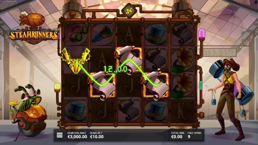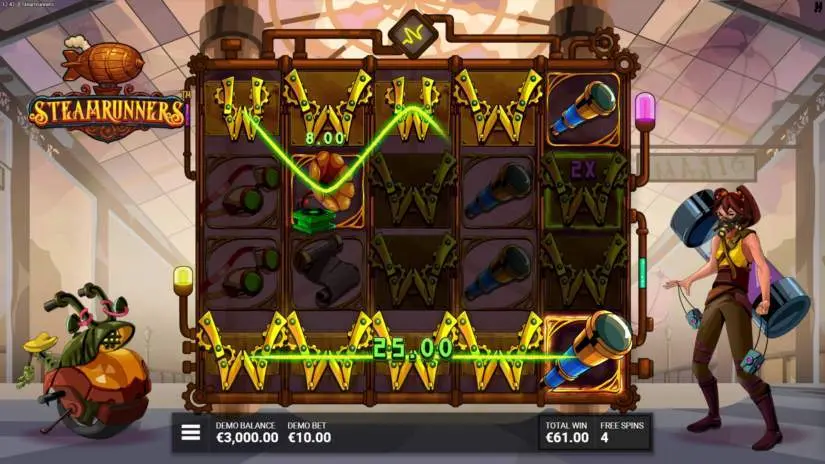 The maximum win in Steamrunners is 10,000 times the current bet level. The maximum win can be achieved by activating certain combinations and/or features.