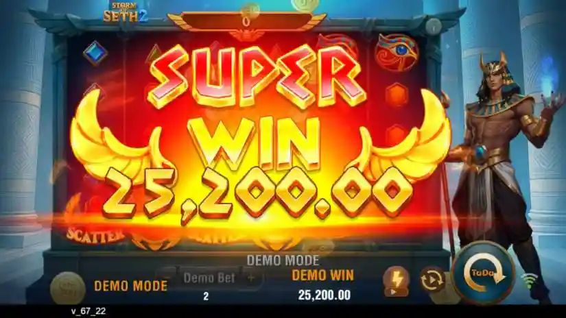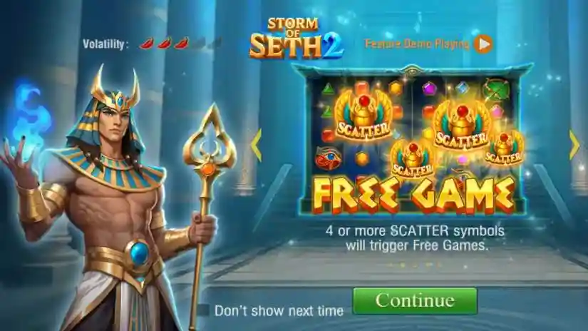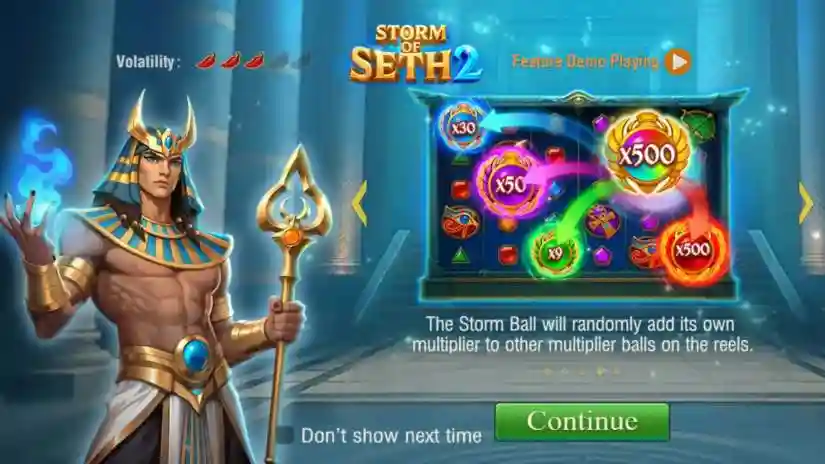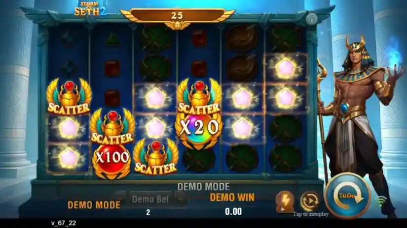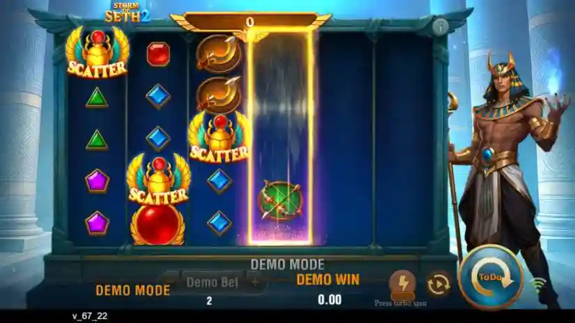 The main game in Storm of Seth 2 is a 5-line, 6-reel slot machine. Eight or more identical symbols can be destroyed on the board to score points. The remaining symbols fall to the bottom of the board, and the empty spaces are filled by new symbols falling from above until no more winning symbols are found. Only the maximum amount won for each winning combination is paid. When multiple winning combinations are formed, all winning points are added together. Free games use the same betting settings as when free games are activated. Winning combinations and payouts are calculated according to the paytable.