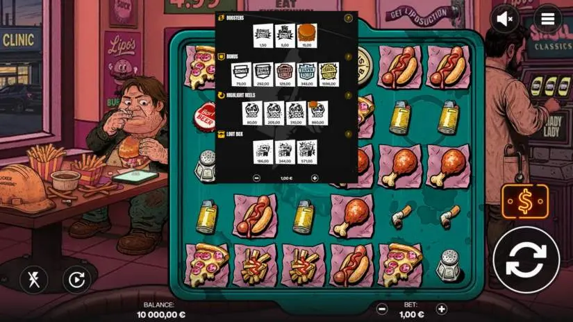A giant burger symbol may appear at any time. Burger sizes range from 2×2 to 5×5. When a burger lands, it reveals a random regular symbol that awards a win. A random number of hot sauce bottles may appear along with the burger. Hot sauce bottles may land randomly or appear behind burger symbols. Bottles can explode after a cascade if there are no other winning combinations. When exploding, the bottles spray hot sauce in a random linear pattern. Hot sauce positions may contain multipliers or be empty. If hot sauce multipliers from multiple bottles appear in the same position, their values are multiplied. Empty hot sauce positions are removed, triggering an additional cascade.