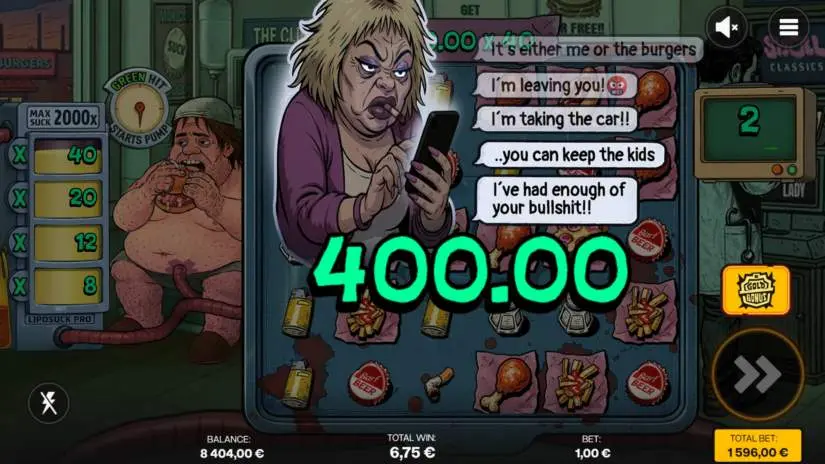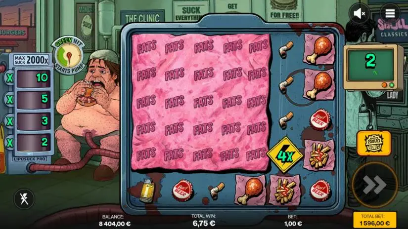 Three Scatter symbols trigger a bonus game with 6 free spins. During free spins, the LipoSuck Pro pump is active. After each spin, the pump indicator rotates, indicating activation. Landing in the green zone activates the pump. The pump has 4 levels, each with its own multiplier. When activated, a random pump level is selected, and its multiplier is applied to the win for that spin. Randomly, the player can kick the pump, either increasing the level or combining the current level’s multiplier with the increased level’s multiplier.