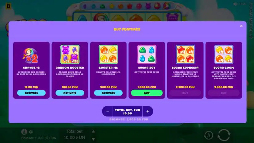 After clicking the “Buy Bonus” button, purchase prices will be displayed in a pop-up window. Prices depend on the bet—if the bet changes, the prices also change. You cannot activate multiple bonuses at once; only one can be active.