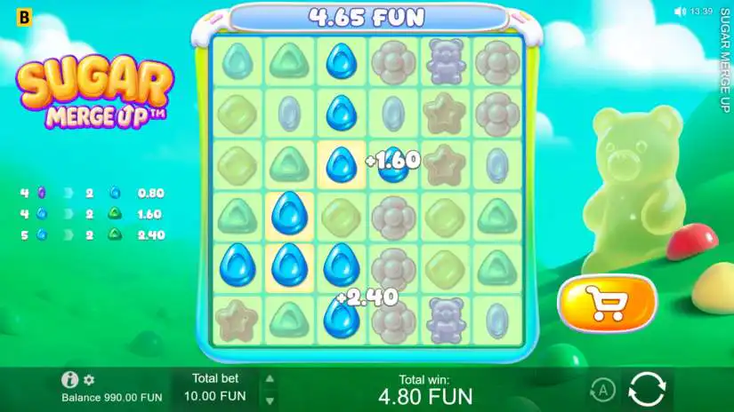 Immerse yourself in a delicious sugar rush with Sugar Merge Up from BGaming. Spin the reels and watch colorful jelly candies cascade and evolve—whenever 4 matching symbols form a cluster, they award a win and advance to the next level. There are also special bubblegum symbols that burst and clear surrounding cells, making room for new clusters. They also transform into Scatter symbols, and landing 3 Scatter symbols triggers Free Spins. Multipliers add even more excitement. If you land winning combinations on the same cells twice in a spin, your next win on that cell is multiplied by 2x. Each subsequent winning combination on these cells doubles the multiplier. The Free Spins round adds even more excitement—cell multipliers continue to increase throughout the round. In total, the cell multiplier can reach a whopping 128x!