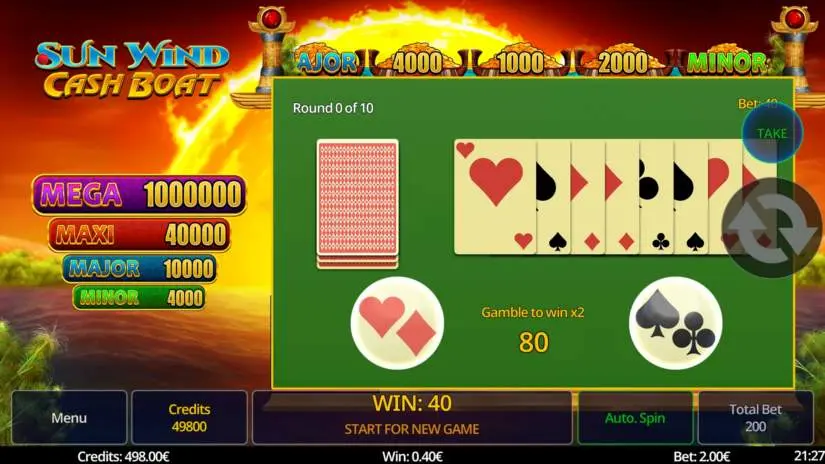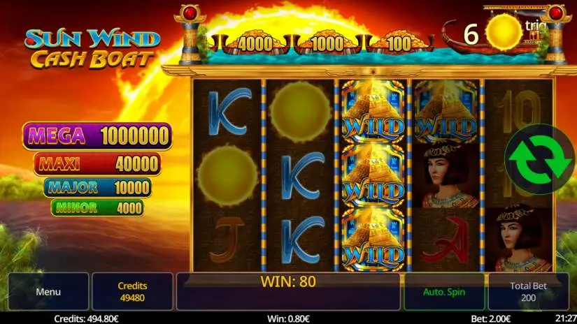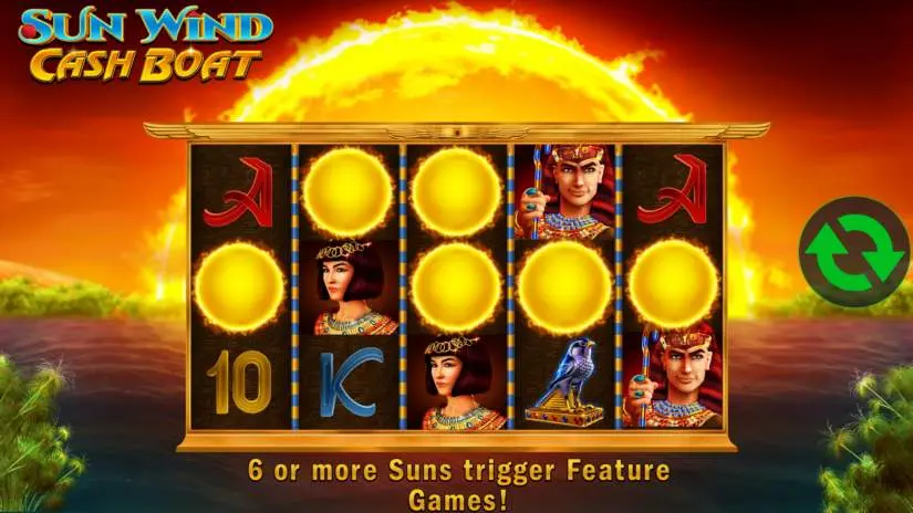 Sun Wind Cash Boat is a 5-reel, 3-row slot from Swintt. The Wild symbol substitutes for all other symbols except the Scatter. Six or more Sun symbols trigger the Cash Boat feature.