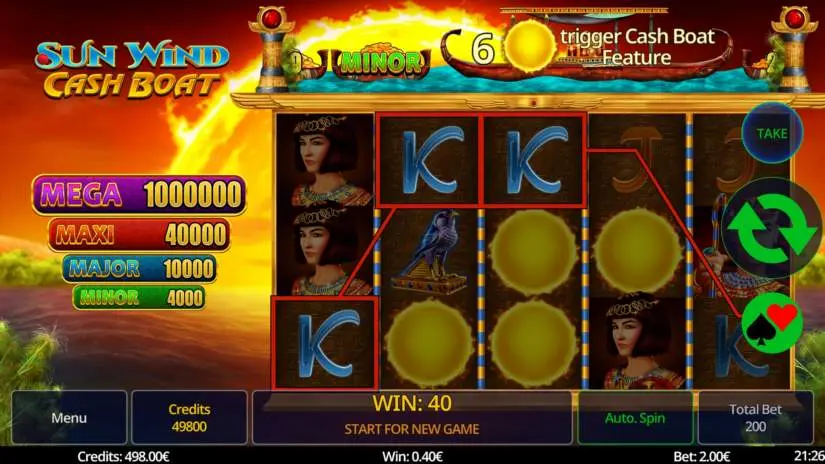 50 paylines are paid left to right in Sun Wind Cash Boat on adjacent reels. Only the highest combination on a payline is paid. Wins on paylines are cumulative.