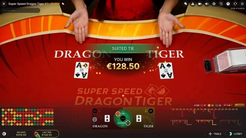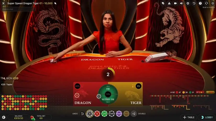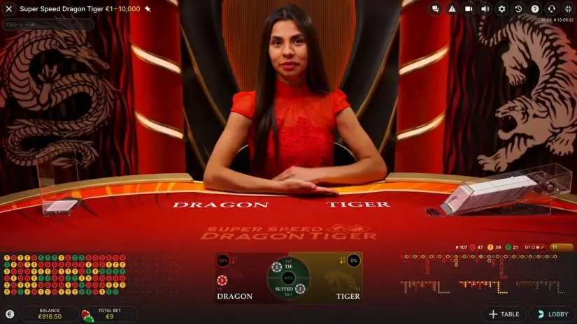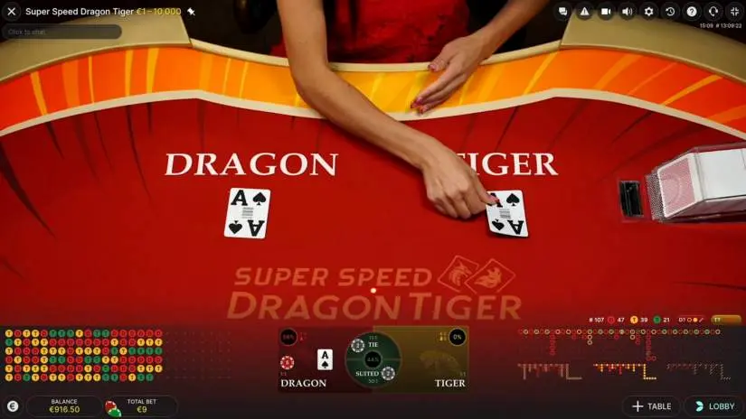 Super Speed Dragon Tiger by Evolution Gaming is a very simple and fast-paced game. The goal of the game is to guess whether the Dragon or Tiger will win by receiving a higher card. In addition, the player can bet that the Dragon and Tiger will receive cards of equal rank, and the round will end in a draw.