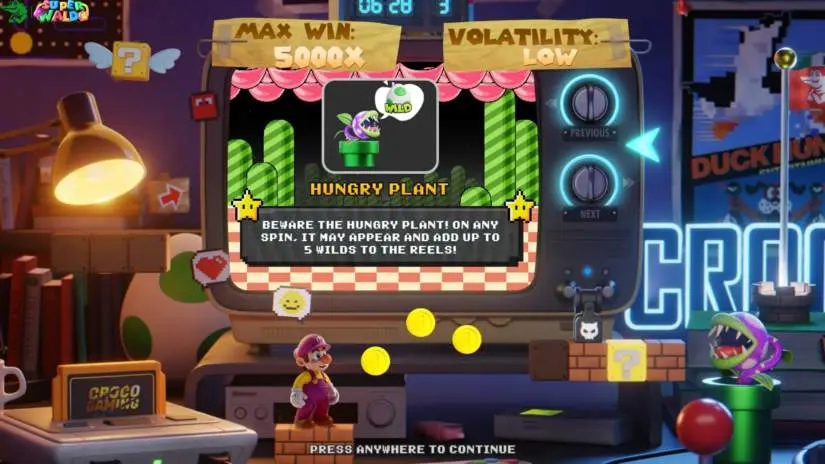 Play the beloved classic game Super Waldo from Croco Gaming, set world records, and unlock all the secret levels. Watch the famous plumber leap from platform to platform, collecting coins and bonuses. Prove your skill and achieve an EPIC victory!