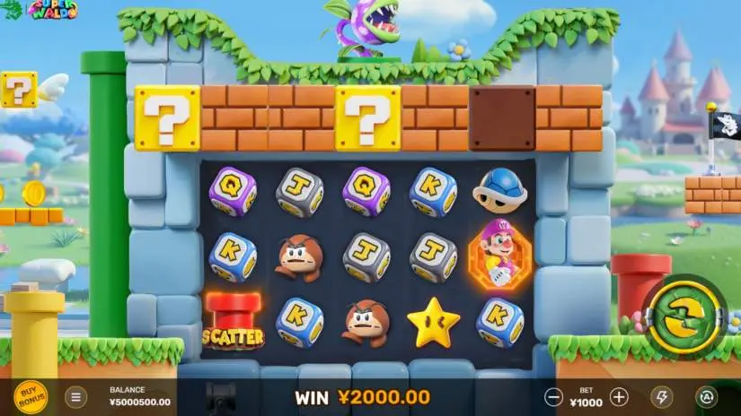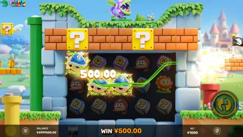The Power-Up Mushroom grants 1 re-spin. The Hungry Plant always activates during this re-spin. Blocks activated before or during the re-spin can only be activated once. The Golden Pipe activates the Secret Level bonus game. Only one Golden Pipe can be opened per spin. The Golden Pipe appears only in the main game.