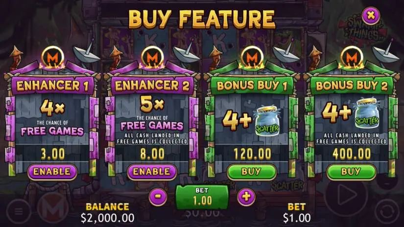 With a bet of 8x the bet, each spin has a 5x chance of triggering free games. All winnings from free games are collected. Enhancer 2 mode activates the Massive Max Win mode, where the maximum win is 50,000x the bet. The theoretical RTP for this game mode is 96.6%.