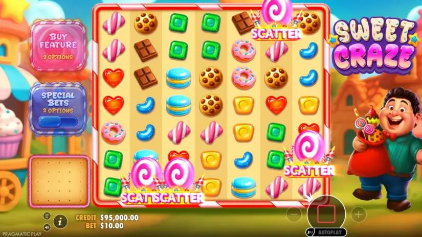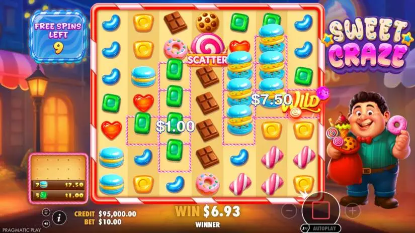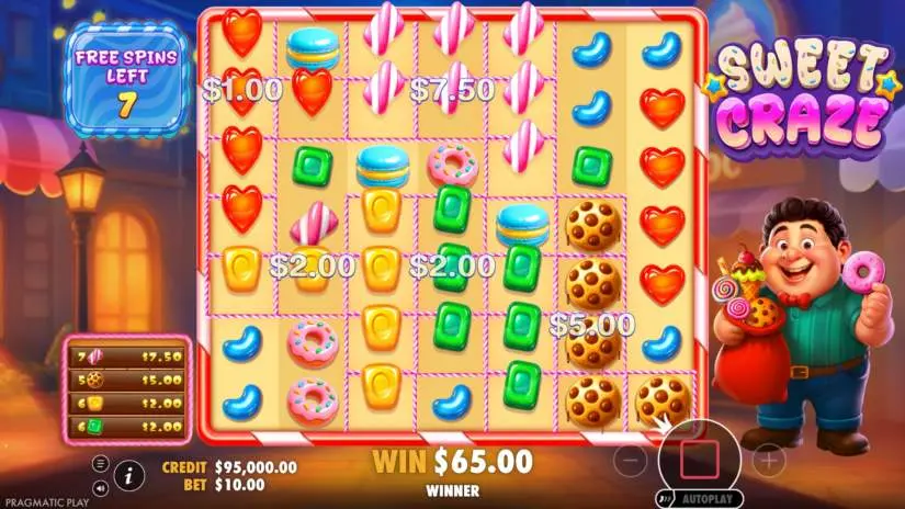 The maximum win in Sweet Craze is capped at 10,000x the bet. If the total win for a round reaches 10,000x, the round ends immediately, the winnings are awarded, and any remaining free spins are cancelled.