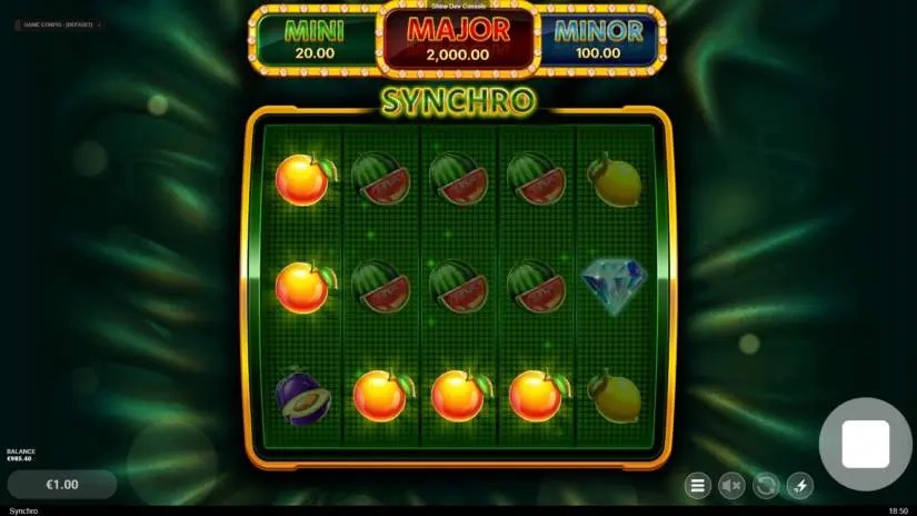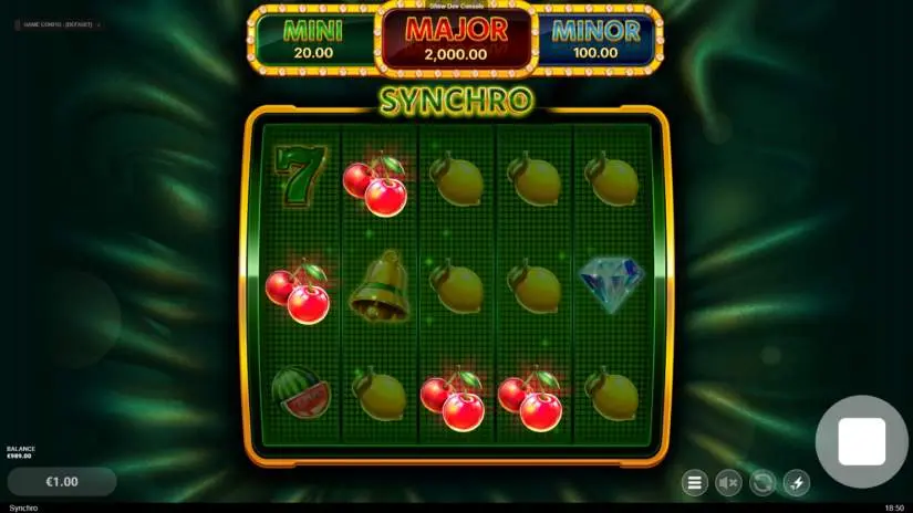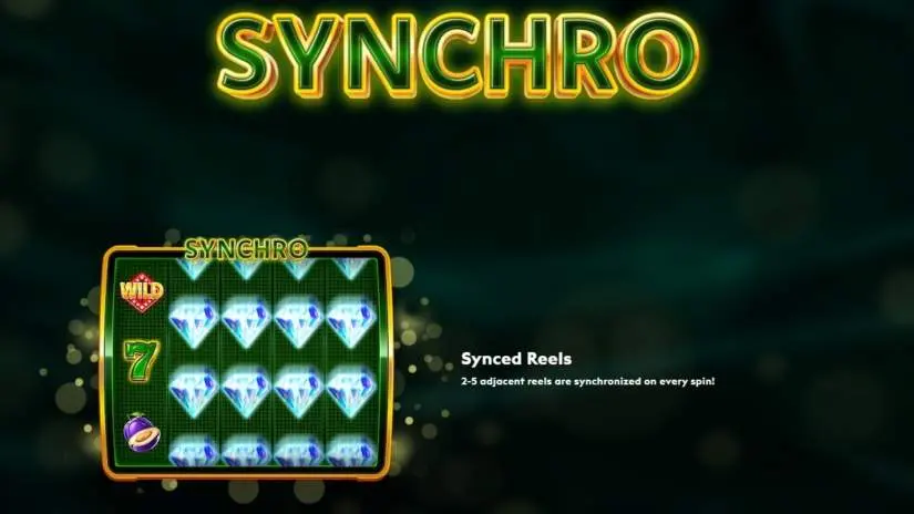 Synchro by Wicked Games is a 5-reel, 3-row slot with 243 ways to win. Winning combinations begin on the leftmost reel, and symbols must appear consecutively on adjacent reels, with the exception of bonus frames, which pay out in any position. Wins and winning combinations are paid out according to the paytable. Symbol payouts displayed in the paytable correspond to the currently selected bet level. Only the highest win is paid for each payline. Matching wins are added together. Malfunctions void all payouts and spins.