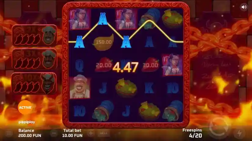 It can land on any reel and substitutes for all symbols except the Bonus and Pepper symbols. Every fourth Wild Cauldron symbol retriggers the feature and awards up to 10 additional free spins, with a maximum of three retriggers. Each retriggering also unlocks a new global multiplier, applied to the total win for each free spin: