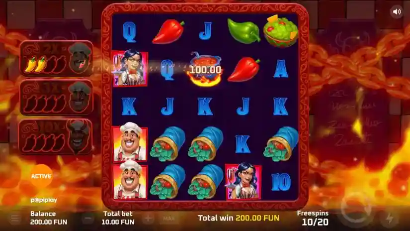 Pepper symbols represent a random cash amount. In the main game, when 3 or more peppers appear on a payline, they award the total of all pepper values. In Free Spins mode, peppers appear only on reels 2–5 and award a win only when the Wild Cauldron lands anywhere on the reels. When activated by a Wild Cauldron, each pepper awards the specified amount regardless of its position.
