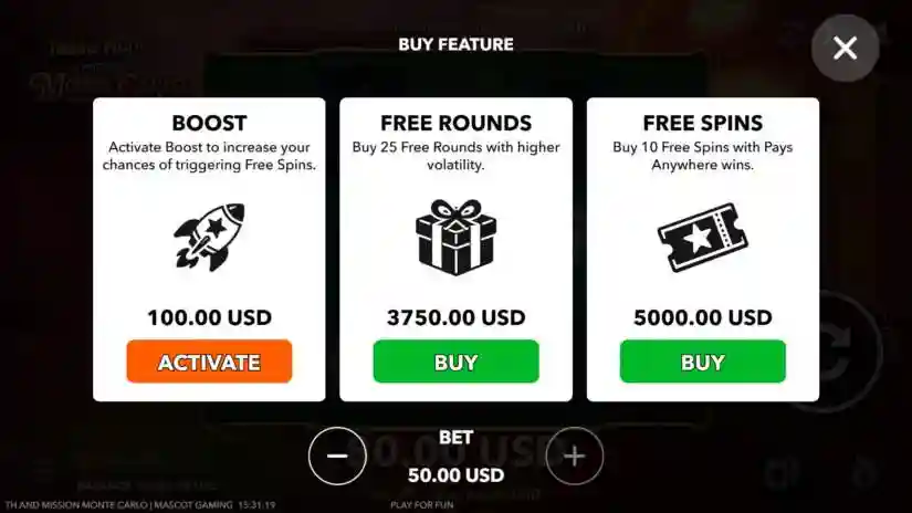 The player can activate the Boost feature, which increases the chances of triggering free spins in the main game. Boost operates on the Ante system, where a fixed bonus is added to each bet when the feature is activated, according to the game rules. Boost can be turned on or off at any time when the reels are not spinning.
