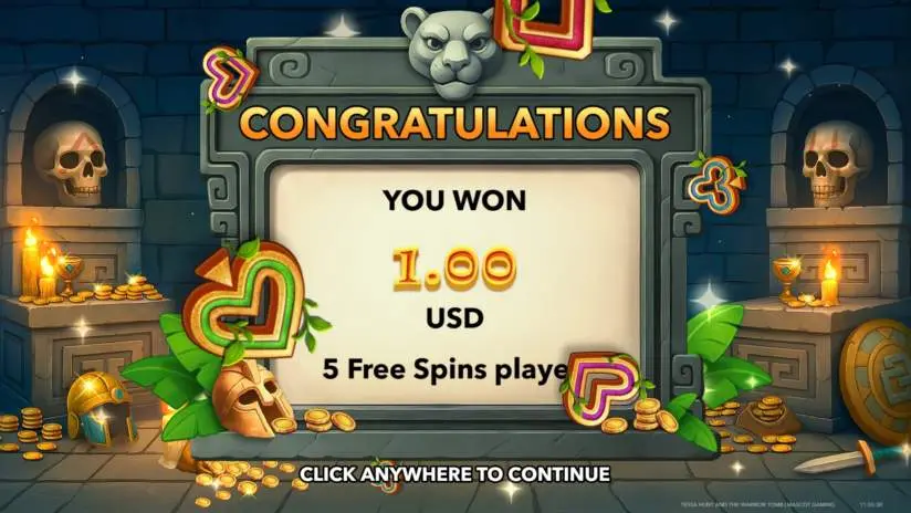 Mascot Gaming’s Tessa Hunt and the Warrior Tomb features 3 types of free spins: with win multipliers of x2, x5, or x10.
