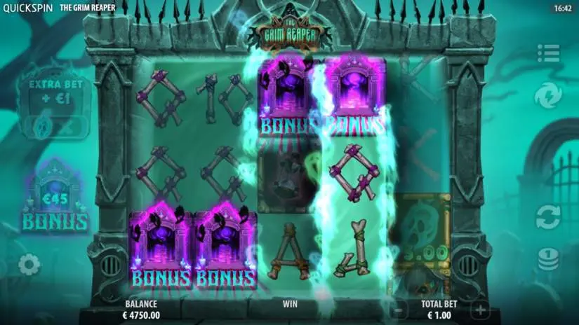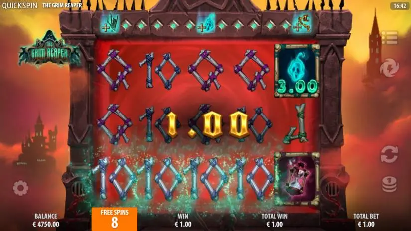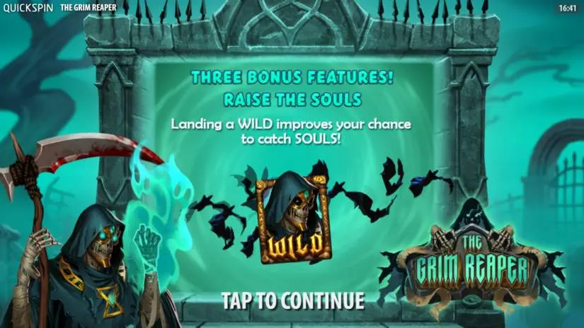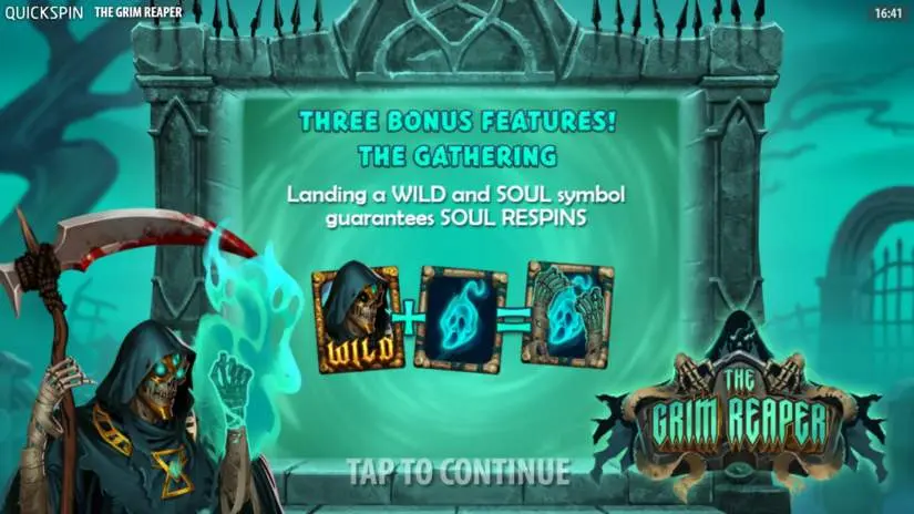 The Grim Reaper by Quickspin is a three-symbol, five-reel, 10-payline game. It features a SOUL COLLECTION feature, SOUL RESPINS, and three types of free spins including THE GATHERING, RAISE THE SOULS, and REAPER HARVEST.