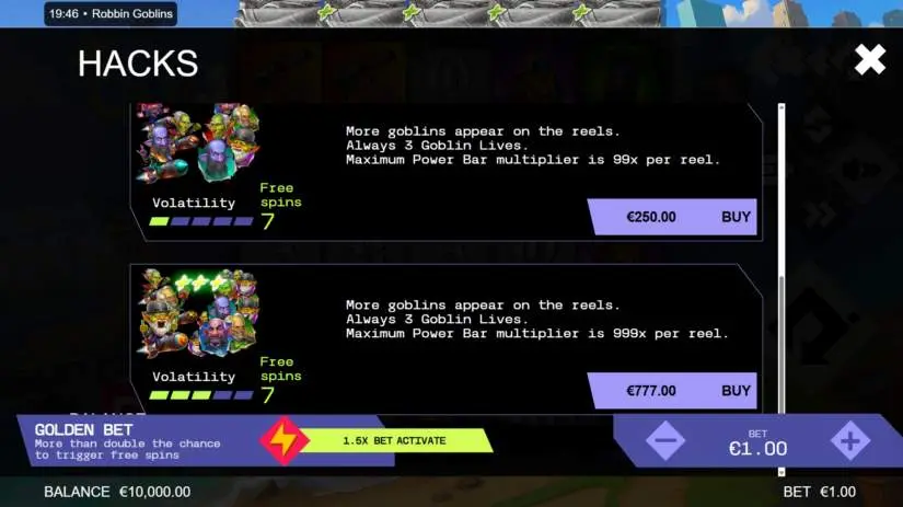 The Robbin’ Gobblins slot hack instantly activates free spins or additional effects during play. There are four hack levels with progressively increasing bonuses.
