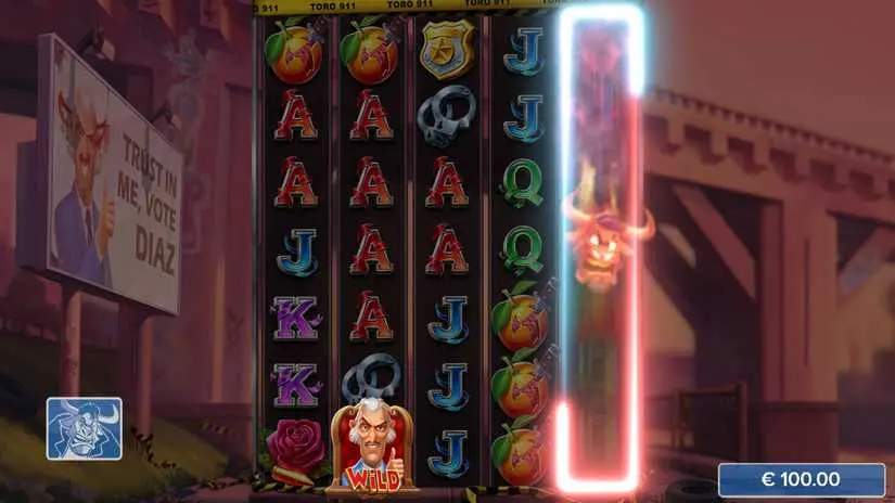 Diaz is a Sticky Wild symbol; it remains on the reels until the reels end or until it is knocked out by Toro.